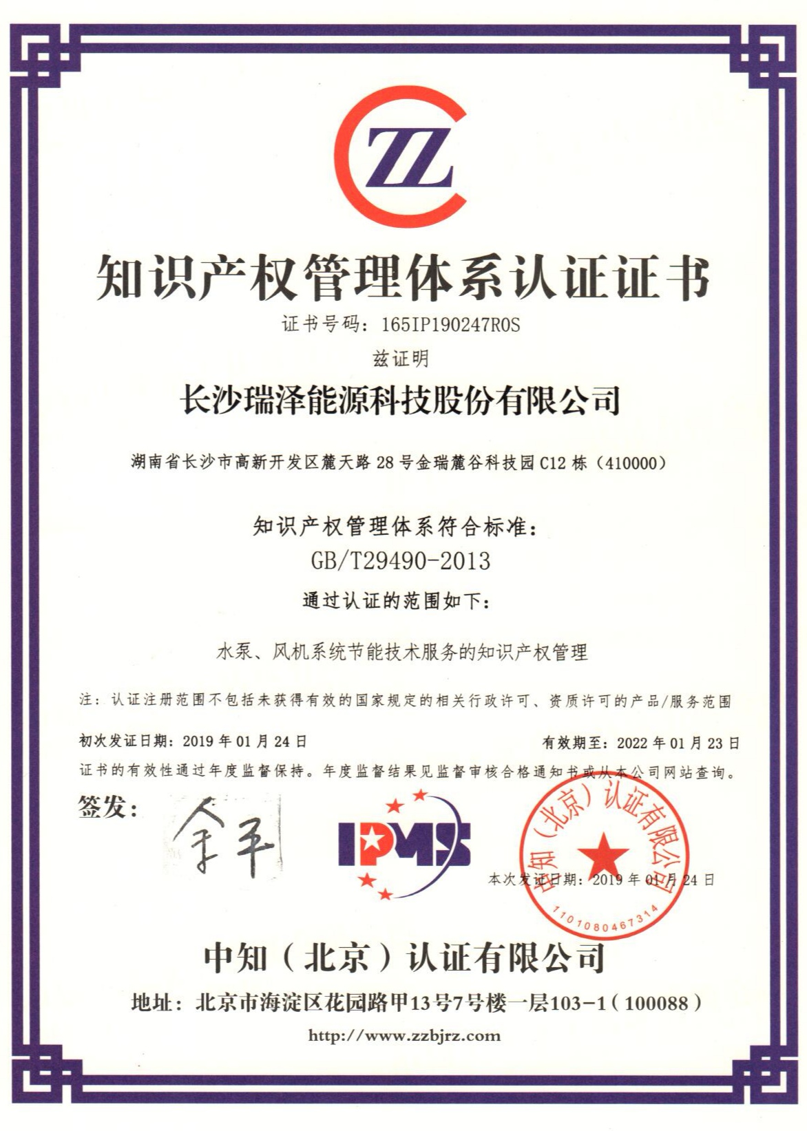 近期,長沙瑞澤能源科技股份有限公司順利通過知識產(chǎn)權(quán)管理體系認(rèn)證,并獲得了中知(北京)認(rèn)證有限公司提供的知識產(chǎn)權(quán)管理體系認(rèn)證證書。