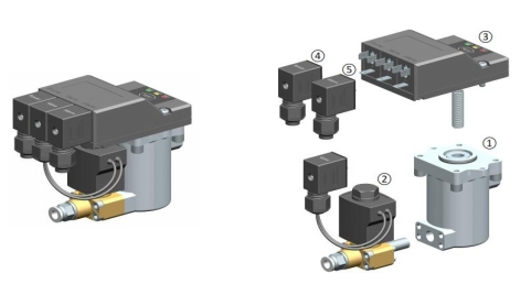 ?、賰λ藿M件,②電磁閥組件(含內(nèi)置過濾網(wǎng)),③控制器組件,④電源接線盒,⑤報警信號接線盒
